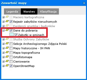 W celu pobrania danych należy w oknie warstw zaznaczyć warstwę Dane do pobrania. Domyślnie warstwa staje się aktywna od skali 1:1 000 000.