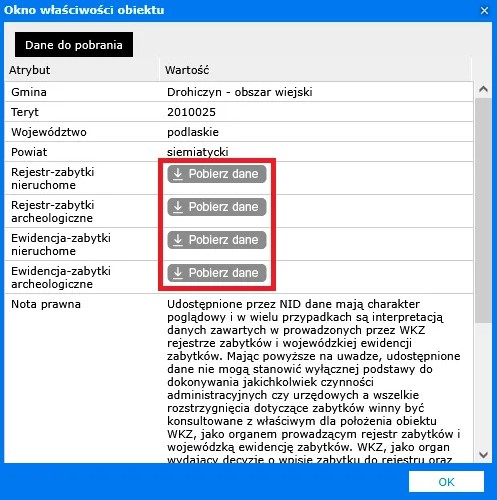 Na stronie pojawi się okno właściwości obiektu, z poziomu którego można pobrać dane.